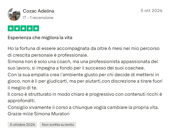 Una donna meravigliosa che grazie al coaching relazionale e alla formazione in Accademia, ha risvegliato la sua Mission, e stravolto la sua professione e vita personale. Dopo tanti anni di un lavoro che non era più il suo, ha preso in mano la sua vita e oggi grazie al coaching, agli oli essenziali, alla sua famiglia e a se stessa, è in un Cammino Autentico, aiutando tante altre persone che si rivolgono a lei.